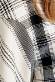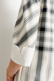 Платье делового стиля длиной до середины колена, выполнено из плательной ткани в комбинации клетка/полоска. Платье прямого свободного силуэта, Спинка прямая с застежкой сзади на потайную молнию, Снизу разрез-шлица. Полочка прямая с нагрудными вытачками из бокового шва. Рукав спущенный, длиной 3/4. К низу рукава пристегивается съёмная манжета из однотона. Горловина круглая, обработана обтачкой. В 36 размере длина по спинке 95см,р.38 96,5см, р.40 96,5см,р.42 96,5см.р48 97,5 см Длина рукава р.36 34 см, р.38 34,5, р.40 34,5 см, р.42 34,5 см, р.48 34,5 см