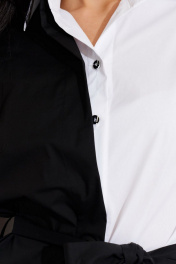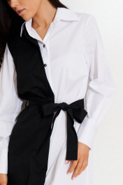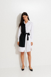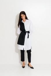Платье -рубашка из хлопковой ткани, со съемным ассиметричным жилетом контрастного цвета. Платье прямого силуэта, длиной ниже колена. По переду застежка на пуговицы. Воротник рубашечный.Рукав на широкой манжете. Низ платья фигурный. Жилет прямого силуэта. По переду и спинке на планках расположены люверсы, в которые продет пояс. Жилет пристегивается к платью на пуговицы.
