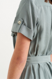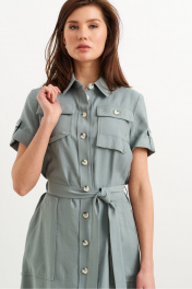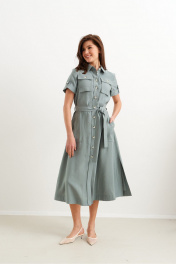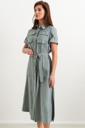 Платье из смесовой ткани, А-силуэта, длиной мидакси. Воротник рубашечный. По переду застежка на пуговицы, выполнены накладные карманы. По спинке двойная кокетка.В боковых швах разрезы. Рукав втачной с отворотной манжетой и патой. Имеется съемный пояс.