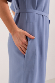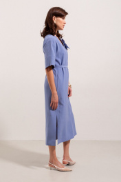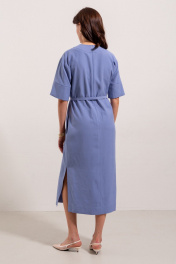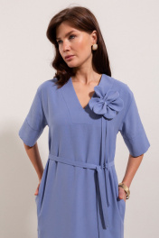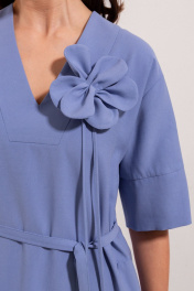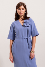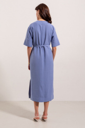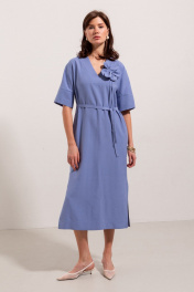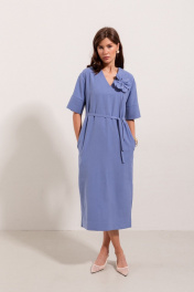 Платье из вискозной ткани, прямого свободного силуэта, длинной миди. Вырез горловины по переду V - образной формы. Вырез головины спинки и переда, а так-же вход в карманы в боковых швах отделан широкой притачной бейкой. Плечо спущенное, рукав рубашечный с широкой притачной манжетой.В боковых швах выполнены разрезы. В центральном шве спинки застежка потайная молния. Имеется съемный декор в виде цветка и завязывающийся пояс.