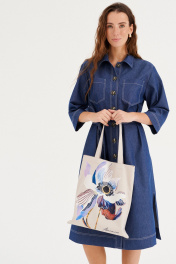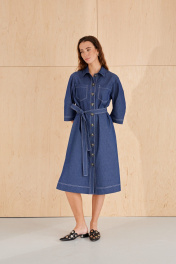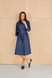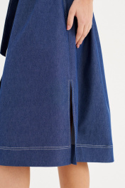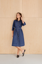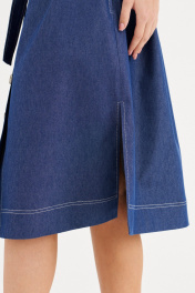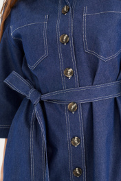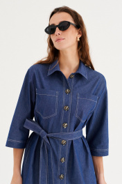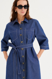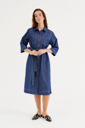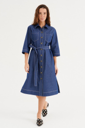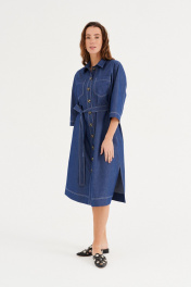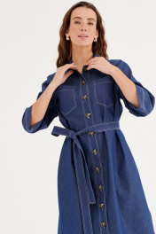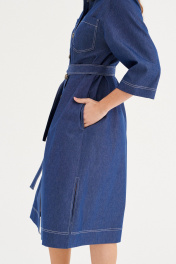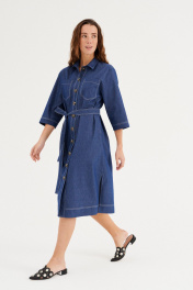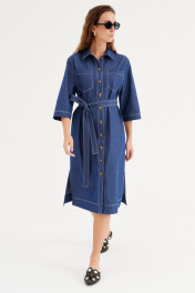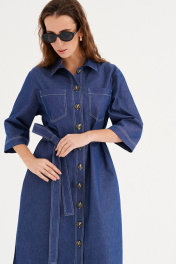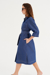 Платье из хлопковой ткани, прямого силуэта, длиной миди. Воротник рубашечного типа. По переду отрезная планка с застежкой на пуговицы, накладные карманы. Рукав двухшовный, рубашечный, длиной 3/4. В бококовых швах выполнены каманы , а внизу разрезы. По спинке кокетка и бантовая складка. Имеется съемный пояс.