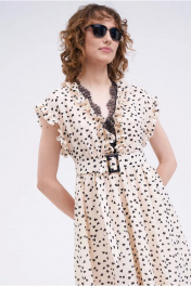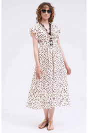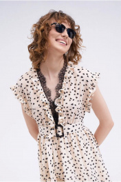 Воздушное удлиненное платье, полуприлегающего силуэта, выполнено из смессового вискозного полотна с принтом – сердечки. Линия плеча мягкой формы, слегка спущена. Вырез горловины «V» - образной формы. Модель отрезная по линии талии, нижняя часть со сборкой. Застежка в среднем шве спинке на тесьму – молнию. Изделие декорировано контрастной французской кружевной каймой и рюшами. Изделие на подкладке. Платье прекрасный самостоятельный предмет гардероба.
