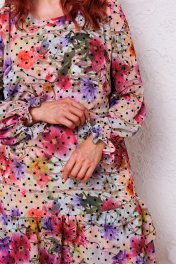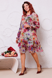 Платье женское прямого силуэта, выполненное из шифона (не тянется), на эластичной подкладке. Подкладка соединена с платьем. Вырез горловины круглой формы, оформленный отрезной планкой. Перед и спинка цельные, по низу платья – два ряда присборенных волана. Рукава втачные, одношовные, по низу собранные на «Венгерку» в несколько рядов. Длина платья по среднему шву спинки - р50,52,54 – 103, р56,58,60 – 107 Длина подкладки – р50,52,54 – 68, р56,58,60 – 72,5 Длина рукава во всех р-ах – 63 Ширина рукава на уровне глубины проймы ½ - р50-20, р52-20,5, р54-21, р56-23,5, р58-24, р60-24,5 Ширина рукава внизу ½ - р50-10, р52-10,5, р54-11, р56-11,5, р58-12, р60-12,5 ОГ ½ - р50-60, р52-62, р54-64, р56-66, р58-68, р60-70 ОТ ½ - р50-58, р52-60, р54-62, р56-64, р58-66, р60-68 ОБ ½ - р50-61, р52-63, р54-65, р56-67, р58-69, р60-71