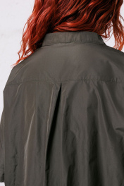 Платье свободного прямого силуэта «оверсайз», выполненное из тафты (не тянется). По переду рельефные швы, накладные карманы. По спинке кокетка и встречная складка для свободы движения. Рукава одношовные. Горловина оформлена воротником-стойкой. Застежка на отрезную планку, на петли-пуговицы. Длина платья по среднему шву спинки во всех р-ах – 94 Длина рукава во всех р-ах – 23 Ширина рукава на уровне глубины проймы ½ - р48-22, р50-23, р52-24 Ширина рукава внизу ½ - р48-25, р50-26, р52-27 ОГ ½ - р48-74, р50-76, р52-78 ОТ ½ - р48-74, р50-76, р52-78 ОБ ½ - р48-75, р50-77, р52-79