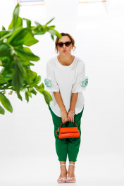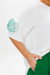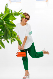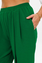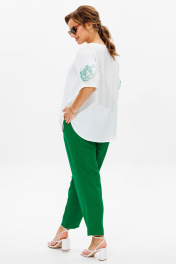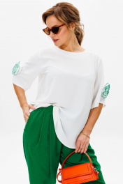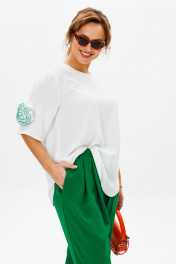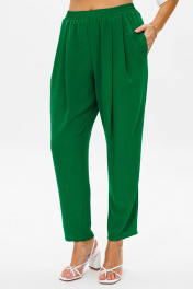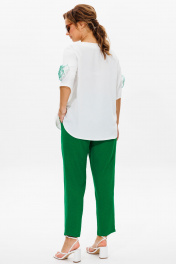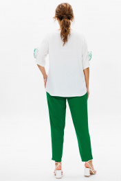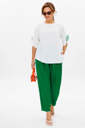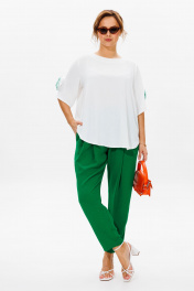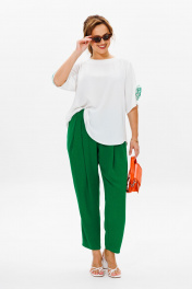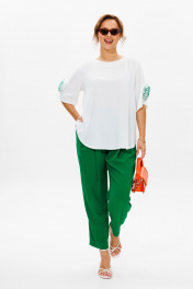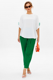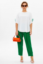 Стильный женский костюм, выполненный из костюмной летней ткани (тянется), состоящий из блузы и брюк. Блуза прямого силуэта. Горловина округлой формы. Низ фигурной формы. Рукава втачные одношовные, декорированы объемными цветами из основной ткани. Длина блузы по среднему шву спинки – р50,52,54 – 68, р56,58,60 – 70 Длина рукава во всех р-ах – 32 Ширина рукава на уровне глубины проймы ½ - р50-22, р52-22,5, р54-23, р56-24,5, р58-25, р60-25,5 Ширина рукава внизу ½ - р50-20, р52-21,5, р54-21 р56-21,5, р58-22, р60-22,5 ОГ ½ - р50-60, р52-62, р54-64, р56-66, р58-68, р60-70 ОТ ½ - р50-60, р52-62, р54-64, р56-66, р58-68, р60-70 ОБ ½ - р50-65, р52-67, р54-69, р56-71, р58-73, р60-75 Брюки-«бананы» с высокой посадкой. В боковых швах наклонные карманы. По передним половинкам мягкие односторонние складки. Верхний срез оформлен поясом с эластичной резинкой. Длина брюк по боковому шву - р50,52,54 – 100, р56,58,60 – 101 Длина брюк по внутреннему шву – р50,52,54 – 71, р56,58,60 – 70 ОТ с раст резинкой (макс) ½ - р50-108, р52-112, р54-116, р56-120, р58-124, р60-128 ОБ ½ - р50-63, р52-65, р54-67, р56-69, р58-71, р60-73 Ширина брюк внизу ½ - р50-18,5, р52-19, р54-19,5, р56-20, р58-20,5, р60-22 Высота посадки спереди – р50,52,54 – 33,5, р56,58,60 – 35,5 Высота посадки сзади – р50,52,54 – 45,5, р56,58,60 – 47,5 Обхват бедра – р50-74, р52-76, р54-78, р56-80, р58-82, р60-84