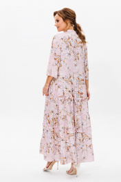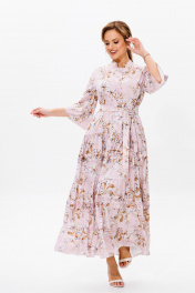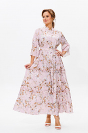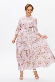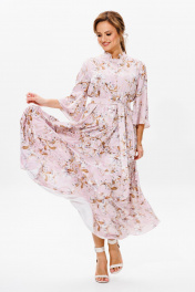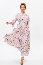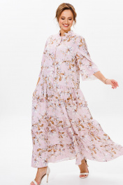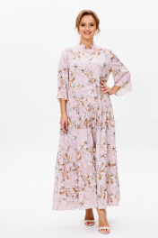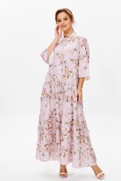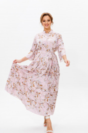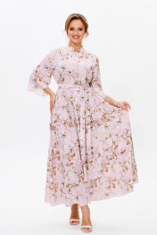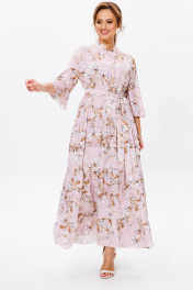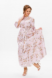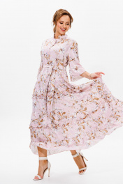 Нарядное женское платье, выполнено из лёгкого струящегося атласа (тянется). Платье отрезное ниже линии талии. Верхняя часть переда с центральной застежкой на петли и пуговицы. Горловина оформлена стойкой. Нижняя часть платья А-образного силуэта, состоящая из трех воланов, декорированных рюшами из основной ткани. Рукава втачные одношовные, расширенные к низу. Длина платья по среднему шву спинки во всех р-ах – 138 Длина рукава во всех р-ах – 42 Ширина рукава на уровне глубины проймы ½ - р52-21,5, р54-22, р56-22,5 Ширина рукава внизу ½ - р52-26,5, р54-27, р56-27,5 ОГ ½ - р52-58, р54-60, р56-62 ОТ ½ - р52-56, р54-58, р56-60 ОБ ½ - р52-70, р54-72, р56-74