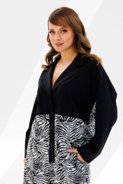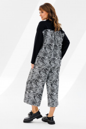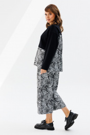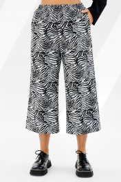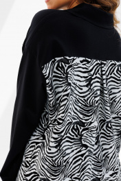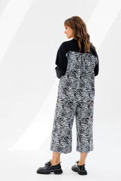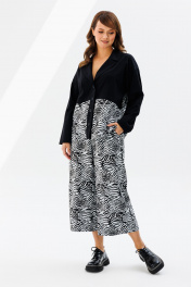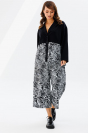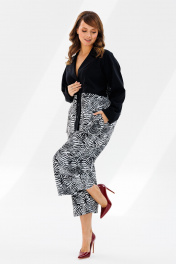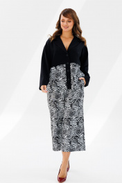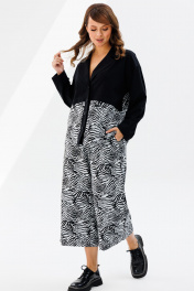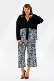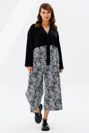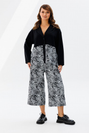 Стильный женский костюм, состоящий из жакета и брюк-кюлот. Жакет А-силуэта со спущенной линией плеча, выполненный из двух видов ткани: трикотажное полотно (тянется) и костюмная ткань с принтом «Зебра» (тянется). По переду отрезные планки, центральная застежка на петли-пуговицы. Горловина оформлена воротником пиджачного типа с лацканом. Спинка с отрезной кокеткой, со встречной складкой по середине. Рукава одношовные. Изюминка жакета – необработанные швы борта и воротника. Жакет без подкладки. Брюки-кюлоты прямого кроя с высокой посадкой, выполненные из костюмной ткани с принтом «Зебра» (тянется). В боковых швах наклонные карманы. Верхний срез оформлен поясом с эластичной резинкой.