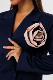 Стильный женский костюм, состоящий из жакета и брюк, выполнен из костюмной ткани (тянется). Жакет прямого кроя на подкладке. По переду нагрудные вытачки, функциональные карманы с листочкой, центральная двубортная застежка на петли-пуговицы. Горловина оформлена воротником пиджачного типа с лацканом. Спинка со средним швом, шлицей-планкой из отделочной ткани, застегивающейся на петли-пуговицы. Рукава втачные, двухшовные. Жакет декорирван съемным цветком из отделочной ткани. Брюки прямого, свободного кроя с высокой посадкой, с наклонными карманами в боковых швах, по срезу банта – застежка-молния. По передним половинкам талиевые вытачки. По низу брюк отрезные манжеты.