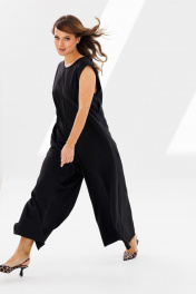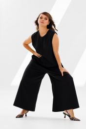 Ультрамодный нарядный комплект, состоящий из блузы и комбинезона. Комбинезон свободного прямого силуэта, выполненный из костюмной ткани (немного тянется). По переду средний шов. По спинке – декоративная металлическая молния в среднем шве. Горловина округлой формы. По боковым швам отрезные ластовицы и функциональные карманы. Длина комбинезона по среднему шву спинки – р48,50,52 – 137, р54,56,58 – 138 ОГ ½ - р48-52, р50-54, р52-56, р54-58, р56-60, р58-62 ОТ ½ - р48-51, р50-53, р52-55, р54-57, р56-59, р58-61 ОБ ½ - р48-58, р50-60, р52-62, р54-64, р56-66, р58-68 Длина брюк по внутреннему шву – р48,50,52 – 63, р54,56,58 – 64 Ширина брючины внизу ½ - р48-49, р50-50, р52-51, р54-51, р56-52, р58-53 Обхват бедра – р48-85, р50-86, р52-87, р54-89, р56-90, р58-91 Блуза полуприлегающего силуэта, выполненная из блузочной ткани (тянется). По переду нагрудные вытачки, центральная застежка на петли-пуговицы. По спинке талиевые вытачки. Горловина оформлена рубашечным воротником со стойкой. Рукава втачные, одношовные, по низу с притачной манжетой, застегивающейся на пуговицы. Изюминкой блузы являются декоративные цветки, настроченные на рукава из отделочной ткани. Длина блузы по среднему шву спинки – р48,50,52 – 59, р54,56,58 – 60 Длина рукава во всех р-ах – 61 Ширина рукава на уровне глубины проймы ½ - р48-17,5, р50-18, р52-18,5, р54-19,5, р56-20, р58-20,5 Ширина рукава внизу ½ - р8-11, р50-11,5, р52-12, р54-12,5, р56-13, р58-13,5 ОГ ½ - р48-53, р50-55, р52-57, р54-59, р56-61, р58-63 ОТ ½ - р48-49, р50-51, р52-53, р54-55, р56-57, р58-59 ОБ ½ - р48-54, р50-56, р52-58, р54-60, р56-62, р58-64