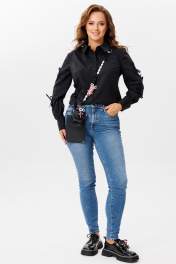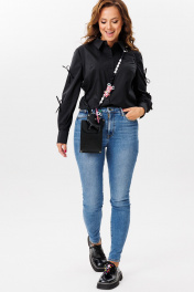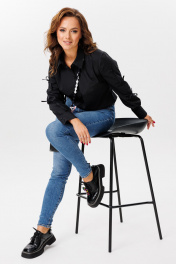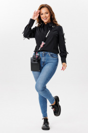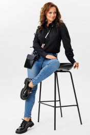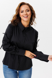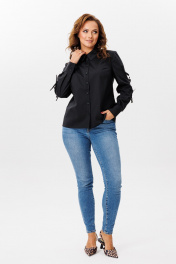 Блуза полуприлегающего силуэта, выполненная из блузочной ткани (тянется). По переду нагрудные вытачки, центральная застежка на петли-пуговицы. По спинке талиевые вытачки. Горловина оформлена рубашечным воротником со стойкой. Рукава втачные, одношовные, по низу с притачной манжетой, застегивающейся на пуговицы. Изюминкой блузы являются декоративные бантики, настроченные на рукава из основной ткани. Длина блузы по среднему шву спинки – р48,50,52 – 59, р54,56,58 – 60 Длина рукава во всех р-ах – 61 Ширина рукава на уровне глубины проймы ½ - р48-17,5, р50-18, р52-18,5, р54-19,5, р56-20, р58-20,5 Ширина рукава внизу ½ - р8-11, р50-11,5, р52-12, р54-12,5, р56-13, р58-13,5 ОГ ½ - р48-53, р50-55, р52-57, р54-59, р56-61, р58-63 ОТ ½ - р48-49, р50-51, р52-53, р54-55, р56-57, р58-59 ОБ ½ - р48-54, р50-56, р52-58, р54-60, р56-62, р58-64