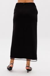 Жакет полуприлегающего силуэта, выполнен из костюмной ткани (не тянется) с отделкой из довяза на подкладке. Перед с нагрудными вытачками и настрочными клапанами. Застежка центральная на петли-пуговицы. Горловина оформлена воротником пиджачного типа с лацканом. Спинка со средним швом. Рукава втачные, двухшовные с мягкими складками и манжетой из довяза. Юбка зауженная к низу, выполнена из костюмной ткани (тянется), без подкладки с отделкой из органзы. По переднему полотнищу средний шов, переходящий в шлицу, талиевые вытачки, наклонные карманы в боковых швах. По заднему полотнищу талиевые вытачки, застежка на потайную молнию в среднем шве. Верхний срез оформлен поясом с резинкой по задней половинке.