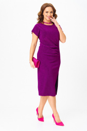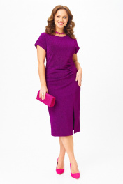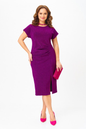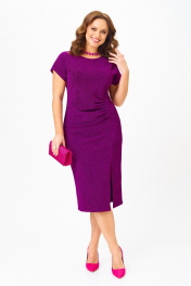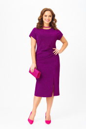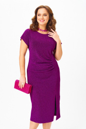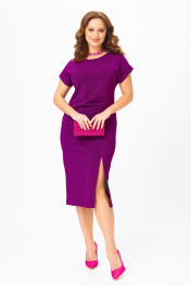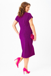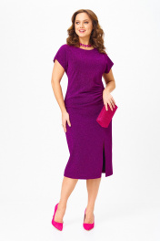 Нарядное женское платье полуприлегающего силуэта со спущенной линией плеча, выполненное из крепа на трикотажной основе с люрексом (легкое мерцание). Полотно эластичное. По левой части переда рельефный шов, переходящий в разрез. По правой части переда в области талии – мягкие складки от рельефного шва. По спинке средний шов. Горловина округлой формы, обработана окантовкой. Платье без подкладки и без застежки.