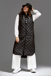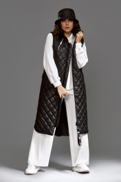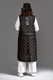 Жилет женский из стеганной ткани (не тянется) на подкладке прямого силуэта, удлиненный. Застежка центральная на молнию. Вырез горловины – воротник «стойка», на полочках обработаны прорезные карманы с клапаном. На спинке настрочена декоративная нашивка и вставлена молния (расстегивается как разрез). Длина жилета – 118 см. 48р – ОГ 112, ОТ 114, ОБ 120 50р – ОГ 116, ОТ 118, ОБ 124 52р – ОГ 120, ОТ 122, ОБ 128