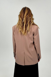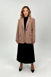 Жакет прямого силуэта, на подкладке выполнен из костюмной ткани. Воротник пиджачного типа, по переду прорезные карманы с клапаном, рукава вточные, по низу рукава шлица с пуговицами, застежка на петлю и пуговицу. По спинке шлица.Жакет на подкладке. К жакету прилогается ремень.