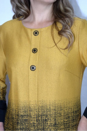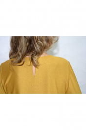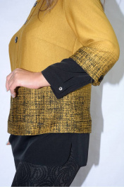 Джемпер женский из 2-х видов материалов, : 1. основной материал - мягкое жаккардовое трикотажное искусственное полотно, в состав которого входит вискозное волокно и 2. отделка - синтетическая однотонная ткань НИАГАРА. Джемпер прямого силуэта, повседневный, для офиса, нарядный, с втачным покроем рукава. Перед с нагрудной вытачкой, идущей от бокового шва, с центральной бантовой складкой, верх которой фиксируется на 3 декоративные пуговицы, с отрезной деталью по низу, по шву притачивания которой обработан пояс, с нашитой декоративной металлической пластинкой ниже шва притачивания пояса. Спинка с отрезной деталью по низу. Низ изделия с закруглениями к боковому шву и разрезами по боковым швам. Рукава втачные одношовные, длиной 7/8, с отрезной деталью ниже локтя, в шве подреза обработана притачная манжета, концы которой фиксируются на одну пуговицу, по низу рукава обработана притачная манжета, концы которой застегиваются на 1 обметанную петлю и 1 пуговицу . Горловина с круглым вырезом, по спинке обработан разрез по горловине, концы которого фиксируются на 1 навесную петлю и 1 пуговицу. Длина изделия р. 52 - 71 см, р. 58 - 74 см. Длина рукава - р. 52 - 54 см, р. 58 - 56 см.