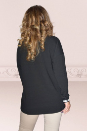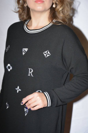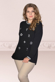 Джемпер женский из мягкого эластичного трикотажного искусственного однотонного полотна. Джемпер расширенного силуэта, повседневный, со спущенным рукавом. Перед с вышивкой контрастного цвета. Спинка цельная. Низ изделия фигурный, перед короче спинки. Рукава спущенные одношовные, длинные, с притачной манжетой по низу из трикотажного довяза контрастного цвета. По горловине обработана бейка из трикотажного довяза контрастного цвета. Длина р. 52 - 79 см, р. 58 - 82 см. Длина рукава р. 52 - 72 см, р. 58 - 74 см.
