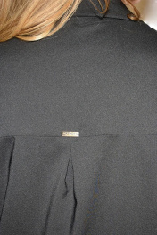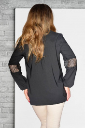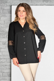 Блузка женская из однотонной смешанной ткани. Блузка прямого силуэта, повседневная, нарядная и для офиса, всё зависит от того, чем будет дополнена данная модель, с втачным покроем рукава, с центральной застежкой на петли-пуговицы. Перед с нагрудной вытачкой, идущей от бокового шва, с отрезной планкой под застежку, на которой обработаны 5 петель и 5 пуговиц. Спинка с кокеткой, в шве притачивания которой обработана встречная складка, выше которой нашита декоративная металлическая пластинка. Низ изделия с разрезами по боковому шву. Рукава втачные одношовные, длинные, на уровне локтя со вставкой из кружева, низ рукава слегка собран на эластичную тесьму. По Y-образному вырезу горловины обработан отложной воротник с отрезной стойкой.