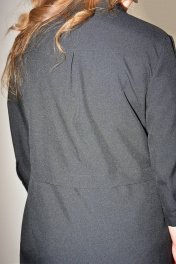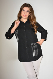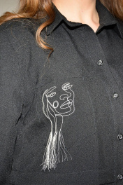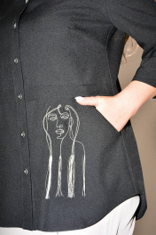 Блузка, привлекающая внимание, из однотонной смешанной ткани. Модель впечатляет своей непринужденной элегантностью, поэтому хороша будет на каждый день. Блузка прямого силуэта, с втачным покроем рукава, с центральной застежкой на петли-пуговицы, с подрезом ниже линии талии, вдоль нижнего среза которого заложена глубокая складка. Перед с нагрудной вытачкой, идущей от бокового шва, с накладным нагрудным карманом, с отрезной планкой под застежку, на которой обработаны 8 петель и 8 пуговиц, по нижней детали переда обработан боковой карман с отрезным бочком. По накладному карману и нижней левой детали переда расположена д изайнерская вышивка с художественным изображением лица . Спинка с кокеткой, в шве притачивания которой обработана бантовая складка. Низ изделия с закруглениями к боковому шву. Рукава втачные одношовные, длиной 3/4, с притачной манжетой по низу, концы которой застёгиваются на одну обмётанную петлю и пуговицу, по шву притачивания манжеты расположена односторонняя складка. По горловине обработан отложной воротник с отрезной стойкой. Блузка п одходит на любую фигуру и выглядит одинаково стильно и великолепно в любом размере.
