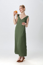 Платье прямого силуэта, с небольшим расширением к низу, длиной макси. Перед с нагрудной вытачкой из бокового шва. Вырез горловины переда и спинки имеют V-образную форму.