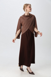 Костюм двухпредметный: состоит из джемпера и платья. Элегантный укороченный джемпер-кейп прямого свободного силуэта с округлой горловиной и фигурным лифом. Рукав втачной широкий, от линии локтя до запястья есть дополнительное отверстие для рук. Платье прямого силуэта, с небольшим расширением к низу, длиной макси. Перед с нагрудной вытачкой из бокового шва. Вырез горловины переда и спинки имеют V-образную форму.