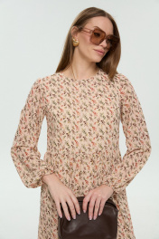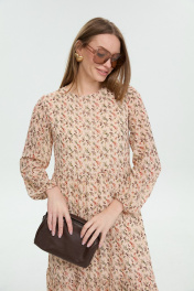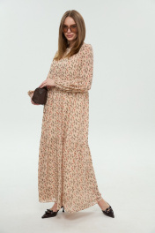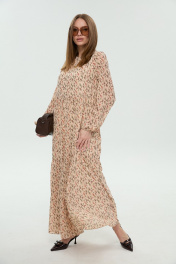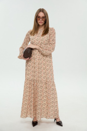 Платье макси прямого силуэта с округлым вырезом, отрезное по линии талии. Рукав немного приспущен, нижний край рукавов оформлен резинкой. По спинке вырез капелька с застёжкой на пуговицу. Изделие на подкладке. По низу юбки широкий волан.