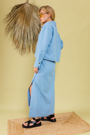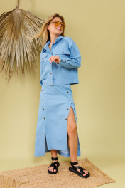 Костюм двухпредметный из облегченного денима: состоит из рубашки и юбки. Укороченная рубашка прямого кроя со спущенной линией плеча. Горловина обработана рубашечным воротником с отрезной стойкой. Застёжка центральная на кнопки. Спереди есть нагрудные карманы. Низ рукава обработан притачной манжетой, застёгивается на кнопки. Юбка длиной миди, расклешенная к низу, с асимметричным низом. Пояс притачной, по спинке собран на резинку. Переднее полотнище состоит из трех частей. Правая часть скреплена отделочной строчкой и кнопками. В боковых швах изделия расположены карманы. По спинке изделия идёт средний шов и две вытачки для удачной посадки по фигуре. Юбка без подкладки.