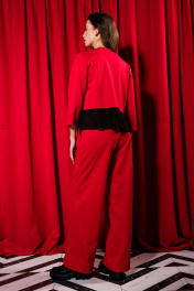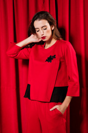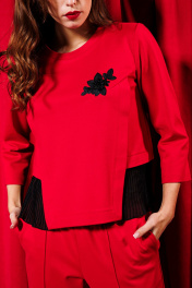 Блуза прямого свободного кроя с округлым вырезом горловины с декоративной нашивкой. По переду две отлетные складки в рельефе. Рукава втачные длиной три четверти. По низу изделия притачной волан из трикотажного гофре.
