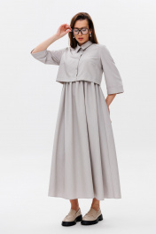 Воздушное платье, состоящее из лифа и юбки, имитирующее костюм-двойку. Лиф прямого кроя с втачным рукавом три четверти. Горловина обработана рубашечным воротником с отрезной стойкой. Застёжка центральная на пуговицы. По талии собрано на резинку. Юбка А-силуэта.