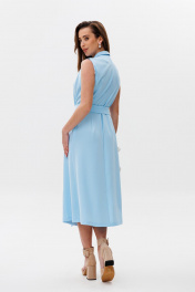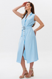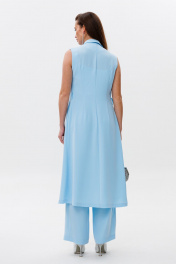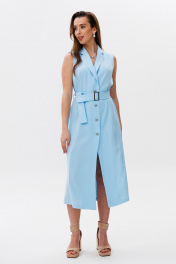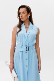 Многофункциональное платье-жилет макси полуприлегающей силуэтной формы без рукавов. Полочка со смещённым бортовым краем назапах, с рельефными швами от линии плеча до низа. Застежка на петли и пуговицы. Спинка со средним швом и талиевыми вытачками. Воротник отложной с отрезной стойкой. В комплект входит пояс из основной ткани с отделочной пряжкой. Идеально комплектуется с брюками в качестве удлиненного жилета.