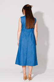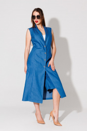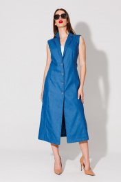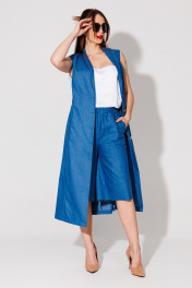 Костюм трехпредметный: состоит из топа, жилета-платья и шорт. Жилет удлиненный полуприлегающей силуэтной формы без рукавов. Полочка со смещённым бортовым краем назапах, с рельефными швами от линии плеча до низа. Застежка на петли и пуговицы. Спинка со средним швом и талиевыми вытачками. Воротник отложной с отрезной стойкой . Топ на регулируемых бретелях с полукруглым вырезом. Шорты свободного кроя, верхний срез представлен широкой резинкой, с карманами. Низ изделия не обработан
