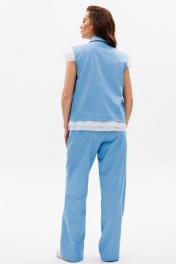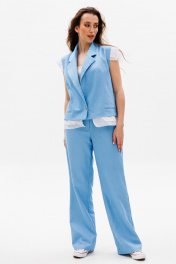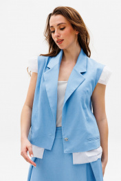 Жилет прямого силуэта однобортный. Воротник пиджачного типа. Застежка на петлю и пуговицу. По краю изделия вставки из рубашечного хлопкового полотна не обработаны, создают имитацию многослойности.
