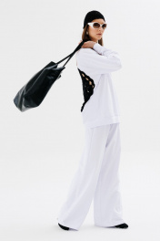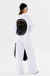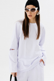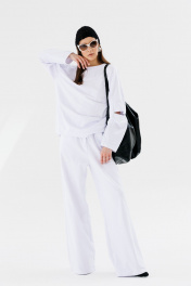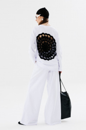 Джемпер свободного силуэта с округлой горловиной. Рукав комбинированного кроя, с передними и задними швами. Верхняя и нижняя часть рукава образуют между собой разрез. По спинке изделие декорировано авторским вязаным элементом ручной работы.