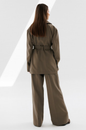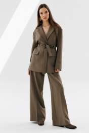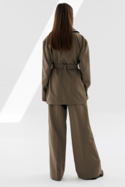 Брюки прямого кроя. На передних половинках брюк карманы с наклонным входом и отрезной боковой частью. Пояс притачной, подкройной. Линия талии приспущена.