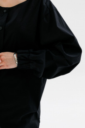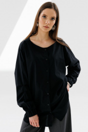 Рубашка прямого кроя с центральной застёжкой на петли и пуговицы. Вырез горловины глубокий округлый. Линия плеча приспущена. На рукавах изделия заложены декоративные защипы, по низу - широкая резинка. Рукава - фонарики.
