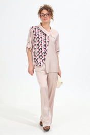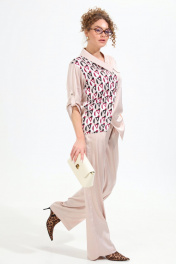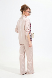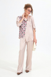 Костюм двухпредметный: состоит из жакета и брюк. Жакет рубашечного типа прямого силуэта с асимметричным низом. Рукав втачной со спущенной линией плеча, фиксируется на пату. Застежка центральная на петли и пуговицы, смещённая по косой. На левой полочке накладной карман с клапаном. Воротник отложной на стойке до половины спинки. Брюки свободного кроя из гладкой ткани сочетают элегантность и комфорт. Широкая резинка на поясе и наличие функциональных карманов подчеркивают удобство модели.