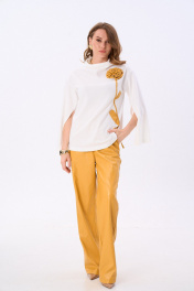 Джемпер-кейп прямого свободного силуэта. Горловина с цельнокроеным воротником-стойкой. Рукав втачной широкий, от линии локтя до запястья есть дополнительное отверстие для рук. Декорирован цветком из контрастной ткани.