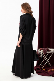 Костюм комбинированный двухпредметный: состоит из жакета и юбки. Жакет рубашечного типа прямого силуэта с асимметричным низом. Рукав втачной со спущенной линией плеча, фиксируется на пату. Застежка центральная на петли и пуговицы, смещённая по косой. На левой полочке накладной карман с клапаном. Воротник отложной на стойке до половины спинки. Юбка - солнце макси с узким поясом. В боковых швах расположены карманы. Застёжка на петлю и пуговицу и молнию по спинке.