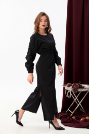 Комплект двухпредметный: состоит из платья-рубашки и манишки. Платье прямого кроя с центральной застёжкой на петли и пуговицы. По линии талии венгерка. Вырез горловины глубокий округлый. Линия плеча приспущена. На рукавах изделия заложены декоративные защипы, по низу - широкая резинка. Рукава - фонарики. Манишка может носиться как отдельно, так и в комплекте с платьем. Вырез горловины округлый. Перед и спинка фиксируются с помощью декоративных полуколец.