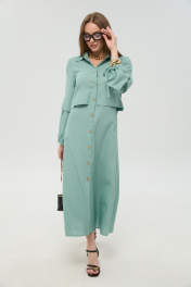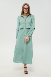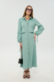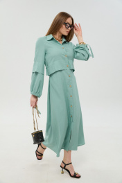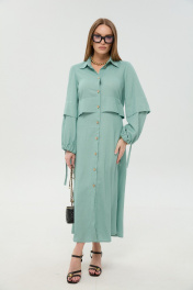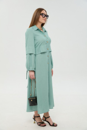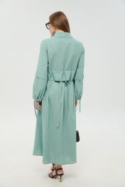 Платье макси с центральной отрезной застёжкой на потайную планку на петли и пуговицы.По переду и спинке цельнокроеные складки на уровне талии. Рукав втачной,одношовный рубашечноно типа. По низу рукава пробиты петли и вставлена завязка для фиксации сборки . Воротник рубашечный стояче отложной. В комплект к изделию идёт пояс из основной ткани для максимально комфортного регулирования объёма.