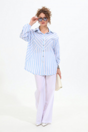 Костюм двухпредметный: состоит из рубашки и брюк. Рубашка прямого силуэта с притачной планкой с застёжкой на петли и пуговицы. Рукав втачной одношовный со спущенной линией плеча с патой. Воротник рубашечный стояче-отложной. Перед состоит из трёх частей : центральная часть ,верхняя часть и нижняя часть. Спинка состоит из двух частей . Линия низа фигурная с широкой окантовкой. Жилет съёмный прямого силуэта без застёжки, воротник пиджачного типа. Линия низа фигурная, в комплект идёт пояс из основной ткани. Брюки свободного кроя сочетают элегантность и комфорт. Широкая резинка на поясе с завязками и наличие функциональных карманов подчеркивают удобство модели.