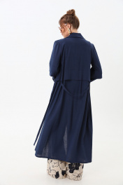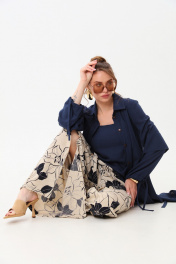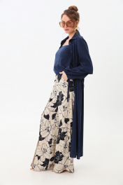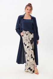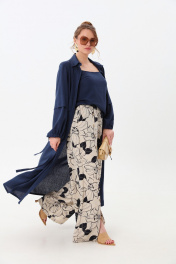Костюм трехпредметный: состоит из кардигана-платья, брюк и топа. Платье-кардиган макси с центральной отрезной застёжкой на потайную планку на петли и пуговицы.По переду и спинке цельнокроеные складки на уровне талии. Рукав втачной,одношовный рубашечноно типа. По низу рукава пробиты петли и вставлена завязка для фиксации сборки . Воротник рубашечный стояче отложной. В комплект к изделию идёт пояс из основной ткани для максимально комфортного регулирования объёма. Брюки свободного кроя, верхний срез представлен широкой резинкой, с карманами. По центру правой брючины расположена планка с функционирующими петлями и пуговицами. Топ на тонких регулируемых бретелях.