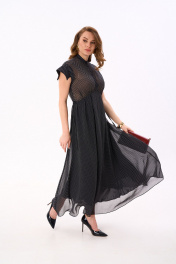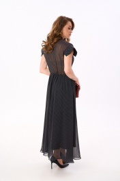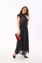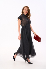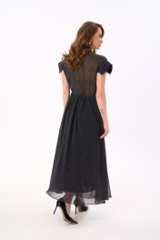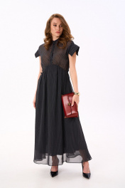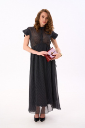 Платье макси с центральной застёжкой на петли и пуговицы, со спущенной линией плеча. В верхней части фигурной полочки сборки. Плечевой шов смещен в сторону переда. По спинке линия талии собрана на кулисы для придания нужной силуэтной формы. Воротник-стойка застёгивается на петлю и пуговицу. Рукав короткий. Юбка расклешена к низу, на подкладке.