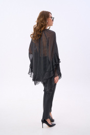 Костюм двухпредметный: состоит из блузы и брюк. Блуза свободного силуэта с присборенной горловиной, обработанной бейкой. Спинка со средним швом, переходящим в разрез. Рукава реглан с асимметричными воланами. Нижний край блузы с двойным воланом. Брюки с притачным поясом и с карманами в боковых швах.