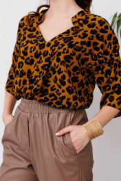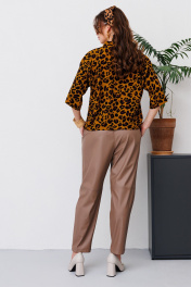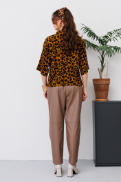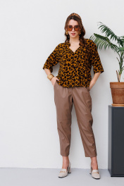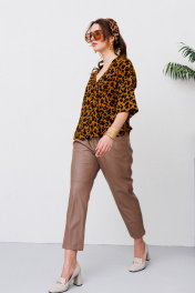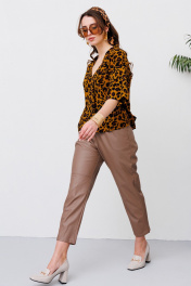 Брюки с притачным поясом, горизонтальным рассечением в области колена и с карманами в боковых швах. Экокожа на хлопковой основе.