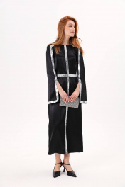 Платье длиной миди полуприлегающего силуэта отрезное по линии талии. Верхняя часть переда со средним швом и вытачкой , нагрудная вытачка объединена с талиевой вытачкой. Нижняя часть переда со средним швом и талиевыми вытачками. Вытачки верхней и нижней частей переда расположены на одной оси. Верхняя часть спинки со средним швом и талиевой вытачкой. Нижняя часть спинки со средним швом, талиевой вытачкой. Рукав втачной двухшовный. В шве по переднему перекату располагается разрез. Вырез горловины круглой формы, обработан обтачками. Застежка в среднем шве спинки на потайную тесьму-молнию. Платье декорировано тесьмой из пайеток.