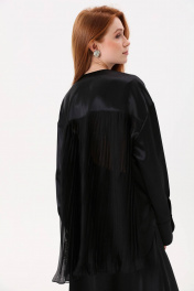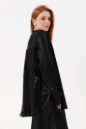 Блуза свободного кроя с округлым вырезом горловины. Центральная застёжка на петли и пуговицы. Рукав втачной одношовный спущенный с притачной манжетой на петлю и пуговицу. Спинка с отрезной кокеткой, нижняя часть спинки декорирована плиссированным шифоном. Низ изделия фигурный. Боковые швы с разрезами.