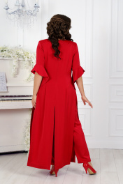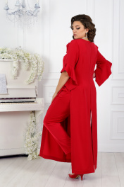 5990 Комплект брючный Представляем вашему вниманию вечерний брючный костюм, созданный с особым вниманием к стилю и комфорту женщин больших размеров. Этот изысканный комплект выполнен из высококачественного сатина, придавая вашему образу нежность и элегантность. Длинная туника этого костюма не только подчеркивает его изысканный характер, но и служит важным элементом создания правильного силуэта для женщин с великолепными формами. Ее линии и длина прекрасно балансируют фигуру, придавая ей гармоничность и элегантность. Комплект брючный 2-х предметный, состоящий из туники и брюк, выполненных из плательной ткани «сатин». Туника полуприлегающего силуэта. Длина по среднему шву спинки 136 см. Перед с нагрудными вытачками, идущими из пройм, с центральным средним швом, в нижней части которого обработан разрез. Спинка с талиевыми вытачками, со средним швом, в верхней части которого расположена застежка на потайную тесьму-молнию, в нижней части-разрез. Ширина отделочной строчки по центральным разрезам переда и спинки-4,0 см. В боковых швах переда и спинки разрезы расположены от уровня талии до низа. Ширина отделочной строчки по боковым разрезам-1,0 см. Горловина переда V-образной формы, горловина спинки округлая. Рукава втачные, одношовные, с притачными по низу фигурными обтачными воланами. Длина рукава от плечевого шва до низа волана - 36 см, длина рукава по нижнему шву до низа волана-59 см. Туника с плечевыми накладками, со съемным декоративным цветком «роза», выполненным из основной ткани. Брюки классические, с посадкой на талии, на притачном поясе с 5-ю шлевками, с застёжкой на тесьму-«молния», расположенную в среднем шве передних половинок, и 1 петлю и 1 пуговицу на поясе. Передние половинки брюк с двумя, застроченными от пояса вниз, односторонними складками, с боковыми наклонными карманами. Задние половинки брюк с талиевыми вытачками, идущими от пояса вниз. Для лучшего прилегания брюк в области талии в поясе по задним половинкам вставлена резинка.