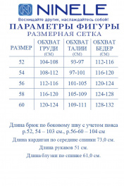 6004 Комплект брючный Этот женский брючный костюм состоит из трёх предметов, идеально подходящих для создания элегантного и стильного образа. Кардиган выполнен из изящного гипюра, который придаёт наряду лёгкость и утонченность. Блузка, изготовленная из трикотажного полотна и гипюра, создаёт гармоничный и комфортный ансамбль, а классические брюки из костюмно-плательной ткани подчёркивают строгость и статусность костюма. Этот наряд станет отличным выбором для праздничных мероприятий, таких как корпоратив или новогодняя ночь. Комплект брючный 3-х предметный, состоящий из: кардигана, выполненного из гипюра; блузки из трикотажного полотна - «масло» и гипюра, и брюк из костюмно-плательной ткани. Кардиган полуприлегающего силуэта, длиной по середине спинки 73,0 см. Перед с нагрудными вытачками, выходящими из пройм. Борта переда оформлены фестонами. Застежка центральная на 3 навесные петли и 3 пуговицы. Спинка с талиевыми вытачками. Горловина спинки и переда круглая. Рукава втачные, одношовные. Длина рукавов 51,0 см. Низа рукавов оформлены фестонами. Блузка полуприлегающего силуэта, длиной по спинки 61,0 см. Перед двухслойный, нижний слой из трикотажного полотна, верхний из гипюра с фестонами по низу, оба слоя с нагрудными вытачками из пройм. Горловина переда круглая углубленная. Спинка из трикотажного полотна, с талиевыми вытачками. Рукава втачные, одношовные, выполнены из гипюра, длиной 21,0 см. Брюки классические, с посадкой на талии, на притачном поясе, с застёжкой на тесьму-«молния», расположенную в среднем шве передних половинок, и 1 петлю и 1 пуговицу на поясе. Передние и задние половинки брюк с талиевыми вытачками, идущими от пояса вниз, с заутюженными стрелками, с боковыми наклонными карманами на передних половинках. Для лучшего прилегания брюк в области талии в поясе со стороны спинки вставлена резинка.