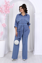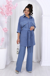 6048 Комплект брючный Откройте для себя безупречное сочетание стиля и комфорта с нашим женским брючным комплектом. Этот универсальный ансамбль — идеальный выбор как для делового офисного образа, так и для праздничного вечера. Легкая блузка прямого силуэта из ткани "лен-вишер" дарит свободу движения и невесомую прохладу в летние дни. Аккуратные накладные карманы и контрастные отделочные строчки придают модели изысканную строгость, а съёмный пояс подчёркивает линию талии, добавляя образу утончённости. Полуприлегающий джемпер из мягкого хлопкового трикотажа нежно облегает фигуру, создавая комфортную посадку. Классические прямые брюки со стрелками, выполненные из той же ткани "лен-вишер", идеально садятся по фигуре благодаря эластичной вставке в поясе. Центральная застёжка на молнию и функциональные карманы добавляют практичности. Этот нарядный и удобный комплект — ваша палочка-выручалочка для любых случаев: от рабочих встреч до вечерних мероприятий. Летний, деловой и элегантный — он подчеркнёт вашу уверенность и безупречное чувство стиля. Комплект брючный 3-х предметный, состоящий из блузки, джемпера и брюк. Блузка прямого силуэта, выполнена из ткани «лен-вишер». Модель со спущенной линией плеча, без плечевых накладок, с однобортной внешней застежкой с отрезными планками на 8 петель и 8 пуговиц. В верхней части переда настрочены накладные карманы с фигурным клапаном, входящим в шов притачивания кокетки и застегивающимся на петлю и пуговицу. Низ кокетки оформлен прямой бейкой. В верхней части спинки – притачная кокетка. Горловина округлой формы со стояче-отложным воротником на отрезной стойке. Рукав длиной 3/4, со сборкой вдоль притачной манжеты, застегивающейся на 1 петлю и 1 пуговицу. В нижней части боковых швов обработаны разрезы, а на уровне линии талии настрочены шлевки, для фиксации съемного пояса. Отделочные строчки по блузке - контрастного цвета. Длина блузки – 86 см (50-58 р-р); длина рукава (от горловины, с учетом манжеты) – 57 см (50-52 р-р), 58,5 см (54-58 р-р). Джемпер полуприлегающего силуэта, выполнен из вискозного трикотажного полотна. Горловина округлой формы, углубленная спереди. Срезы горловины и пройм окантованы косой бейкой. Длина джемпера -- 61 см (50-58 р-р). Брюки классические длинные, прямого силуэта, с посадкой на талии, выполнены из ткани «лен-вишер». Модель со стрелками, с центральной застёжкой на тесьму-«молнию», на притачном поясе, застегивающемся на петлю и пуговицу. Передние и задние половинки брюк с талиевыми вытачками, направленными от пояса вниз. Спереди обработаны боковые наклонные карманы. Для лучшего прилегания брюк в области талии в поясе по задним половинкам вставлена эластичная лента. Длина брюк по боковому (с поясом) - 107 см (50-52 р-р), 108 см (54-58 р-р).
