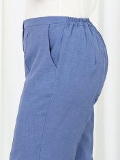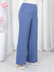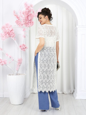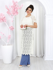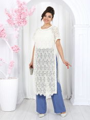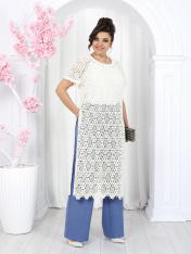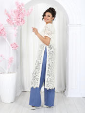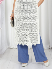 6055 Комплект брючный Представляем вашему вниманию летний брючный костюм, выполненный из натуральной ткани. Нарядная туника из вязаного кружева придаёт образу благородство и изысканность. Классические брюки с безупречной посадкой визуально вытягивают силуэт и делают его стройнее. Базовый топ завершает ансамбль, добавляя практичности и элегантности. Натуральная ткань обеспечивает дышащий эффект, поддерживая комфорт в теплую погоду. Этот праздничный костюм - настоящая находка для вашего гардероба. Он идеально подойдет для офиса, деловых встреч, а также для праздничных мероприятий или летних вечеров. Комплект брючный 3-х предметный, состоящий из туники, блузки и брюк. Туника полуприлегающего силуэта, выполнена из хлопкового кружева. Модель без застежки, без плечевых накладок, с высокими (от талии) разрезами в боковых швах. С изнанки разрезы обработаны хлопковой тесьмой в цвет кружева, закрепленной с лицевой стороны отделочной строчкой шириной 3 см. Круглый вырез горловины переда и спинки обработан обтачкой из костюмно-плательной ткани в цвет кружева; ширина отделочной строчки по горловине 2 см. Рукав втачной, короткий. Длина туники – 117 см; длина рукава – 22 см. Блузка-топ прилегающего силуэта, выполнена из вискозного трикотажного полотна. Модель без застежки, без рукавов, на регулируемых по длине узких бретелях. Верхний край переда окантован. Для лучшего прилегания изделия, в подгибку верхнего края спинки протянута эластичная лента. Длина топа (по спинке) – 37 см. Брюки классические, длинные, с посадкой на талии, выполнены из ткани «лен-вишер». Модель со стрелками. Передние и задние половинки брюк с талиевыми вытачками, направленными от пояса вниз. Спереди обработаны наклонные боковые карманы и центральная застёжка на тесьму-«молнию». Притачной пояс застегивается на 1 петлю и 1 пуговицу; для лучшего прилегания по линии талии в притачном поясе предусмотрена эластичная лента, вставленная по спинке. Длина брюк по боковому (с поясом) -- 107 см (50-52 р-р), 108 см (54-58 р-р)